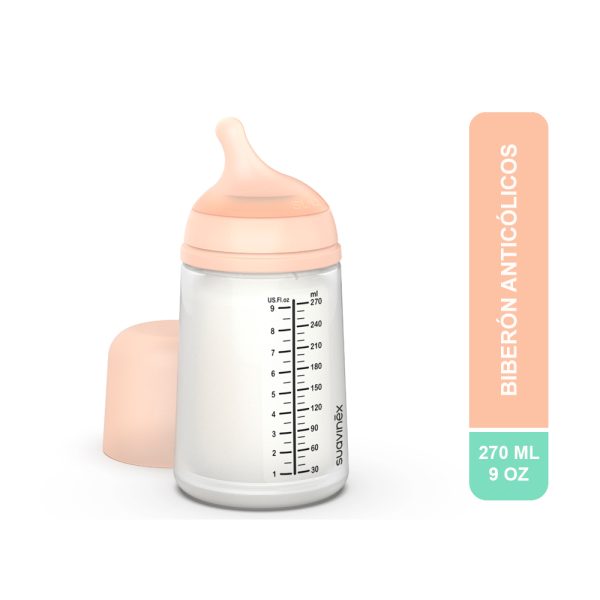 El biberón anticólico ZERO ZERO está indicado desde el nacimiento, incluso para bebés prematuros con fuerza de succión débil. Recomendado para poder combinar con la lactancia materna. Capacidad: 270 ml.